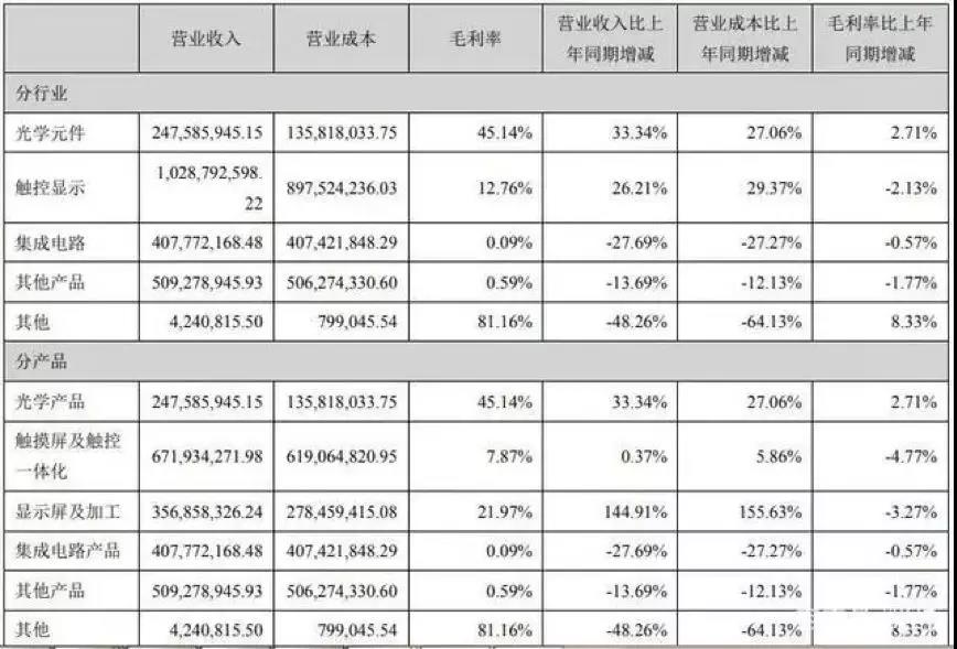 雖然觸控顯示類業(yè)務(wù)是聯(lián)創(chuàng)電子最大的主營(yíng)業(yè)務(wù),但今年上半年,該公司的光學(xué)產(chǎn)品成為光學(xué)產(chǎn)品、顯示屏及加工、集成電路產(chǎn)品、其他產(chǎn)品幾大主營(yíng)分產(chǎn)品中毛利率唯一增加的一個(gè)主營(yíng)產(chǎn)品。